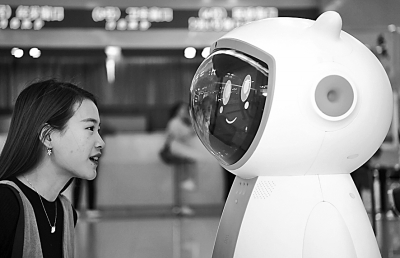 10月15日,市民在南昌市红谷滩新区行政服务中心大厅与政务服务智能机器人“小π”进行互动交流。新华社发