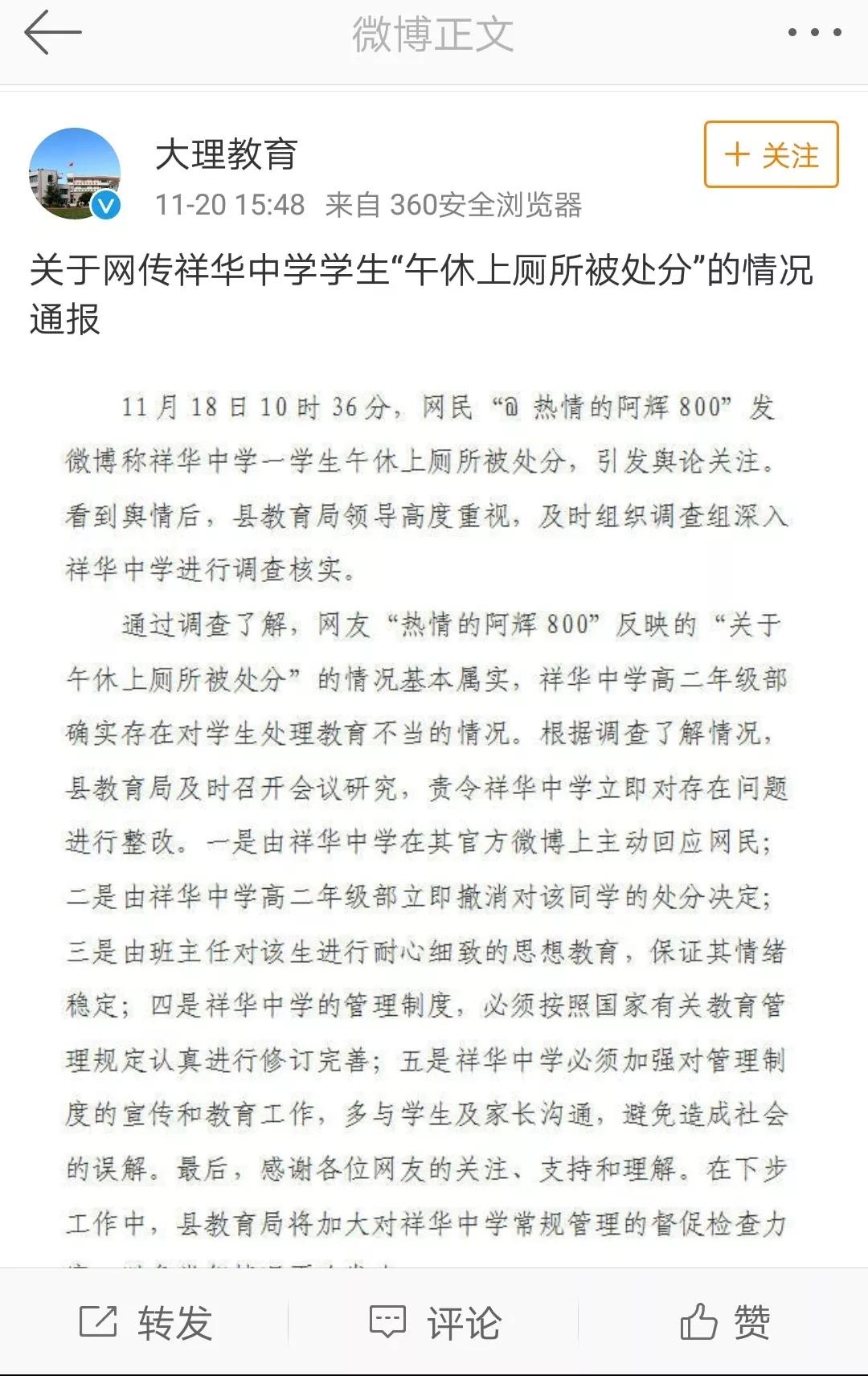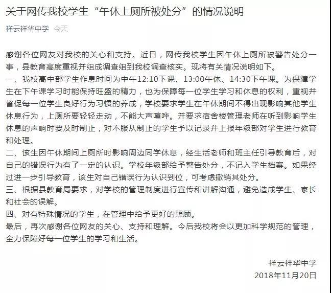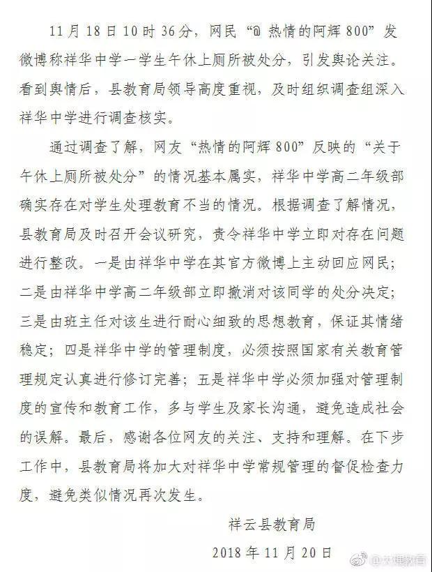 11月20日下午,大理州教育局官方微博“@大理教育”也发布关于“学生午休上厕所被处分”的情况通报: