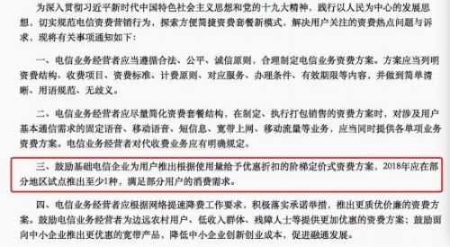 此前工信部表示:鼓励基础电信企业为用户推出根据使用量给予优惠折扣的阶梯定价式资费方案,2018年应在部分地区试点推出至少1种,满足部分用户的消费需求。