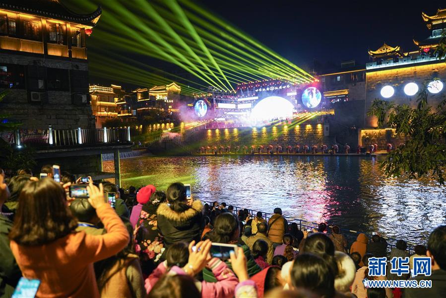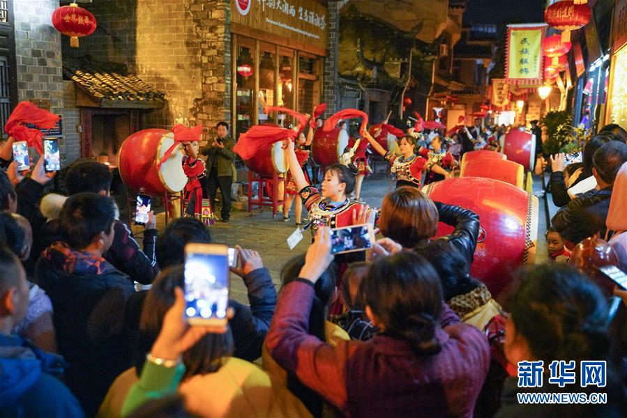 11月22日,游客在乾州古城观看鼓文化节开幕式表演。新华社 记者张笑宇/摄