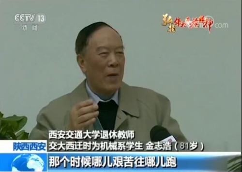 西安交通大学退休教师 交大西迁时为机械系学生(81岁) 金志浩:唱着《再见妈妈》就一路就奔到西安来了。那个时候哪儿艰苦往哪儿跑,党的需要就是我的志愿,那是没话的,也不在乎艰苦。