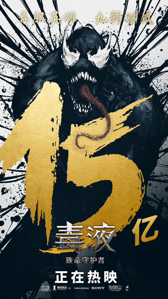 《毒液:致命守护者》自11月9日上映以来,票房一路飘红,累计已达15亿,是目前内地票房最高的单人超英电影。影片连续13天蝉联内地单日票房冠军,超过《复仇者联盟3》(连续11天)的纪录。自内地公映以来,《毒液:致命守护者》就不断的刷新内地影史多项纪录。其中,漫威单人超英首映日预售纪录,零点场纪录,最快破亿纪录,首周末票房纪录,次周票房纪录,每一个都被“毒液”刷新并且抬到全新高度,堪称漫威电影史的一大“奇迹”。