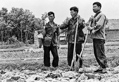 1978年11月,小岗生产队农民严立坤(左)、严俊昌(中)、严立学(右)站在自己承包的土地上,心中充满希望。资料图片