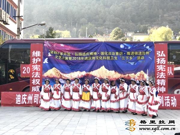 演出在舞蹈《欢庆》中拉开序幕,迪庆州宪法宣传演出队表演了《感恩》《扎西德勒》《一个都不能少》《热巴》等18个歌舞及普法小品。