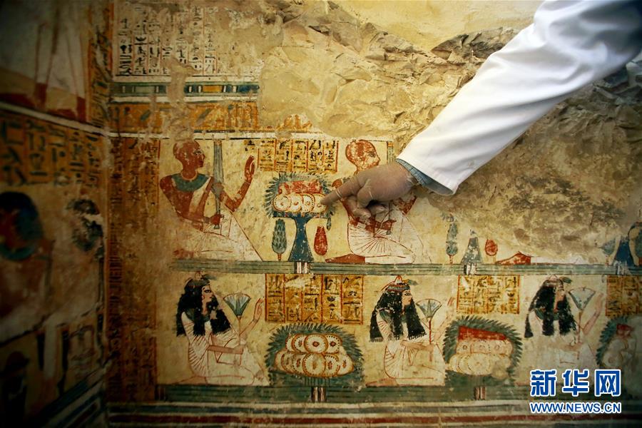 这是在埃及卢克索省尼罗河西岸新发现的古埃及贵族墓葬中的壁画(11月24日摄)。