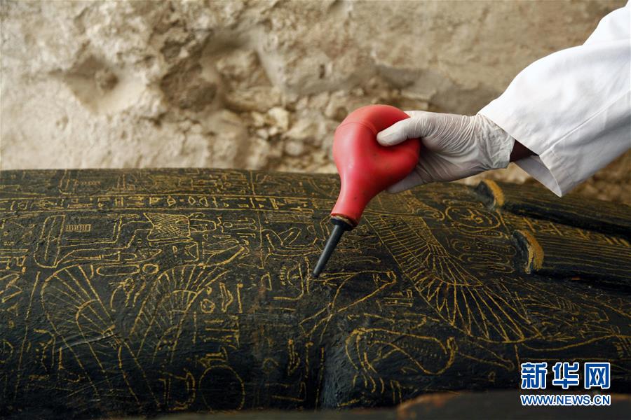 11月24日,在埃及卢克索省,工作人员在考古现场清理出土的棺材。