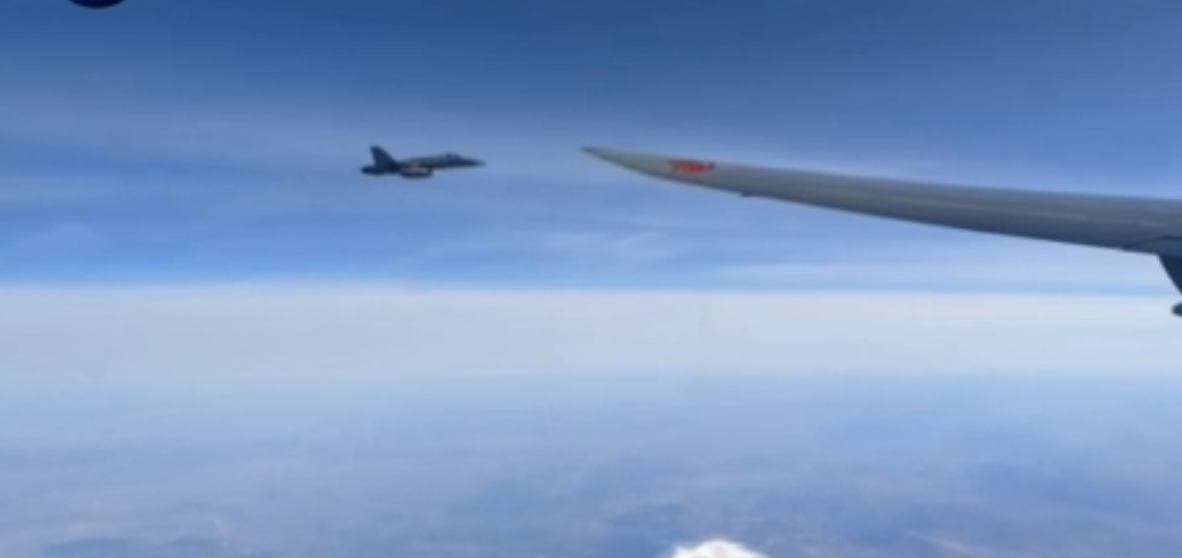 当地时间27日下午三时五分左右,习近平主席乘坐的专机进入西班牙领空时,西班牙两架战斗机全程护航。