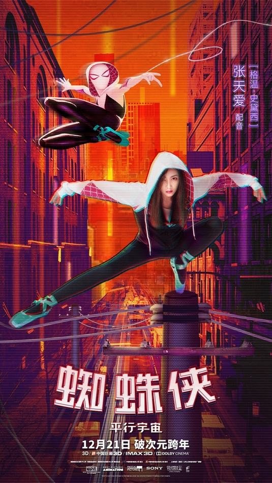 由美国哥伦比亚影片公司,美国漫威公司和美国索尼动画影片公司联合出品电影《蜘蛛侠:平行宇宙》将登大银幕!新片使蜘蛛侠系列中的平行宇宙概念影视化,集结平行空间的六位蜘蛛侠一同反抗恶势力。此次电影国配版将由张天爱声演女蜘蛛侠格温·史黛西,这是张天爱首部动画电影配音作品。