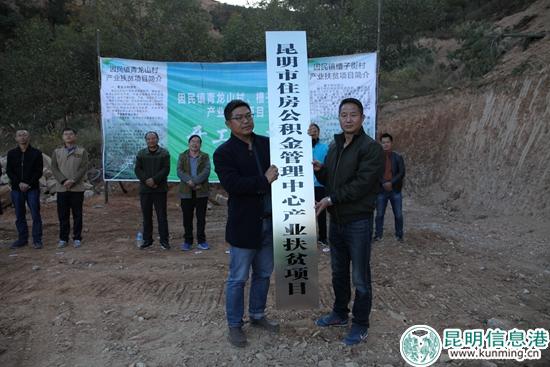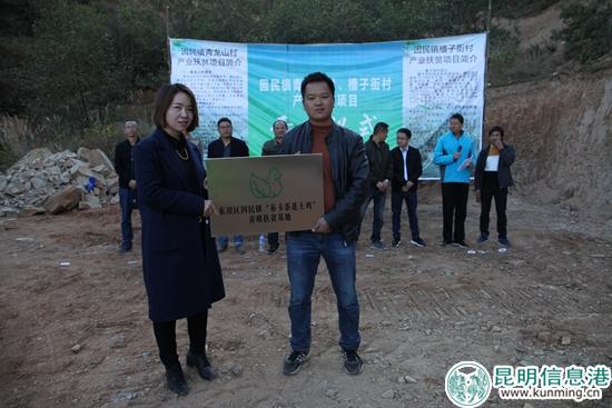 青龙山、槽子街村挂钩帮扶单位领导为两村授昆明市住房公积金管理中心产业扶贫项目牌;云南神沐农业有限公司董事长马关琴分别给青龙山村和槽子街村授东川区因民镇“布卡茶花土鸡”养殖扶贫基地牌。