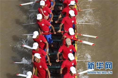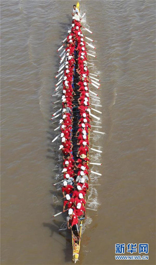 ↑11月20日,在柬埔寨金边的洞里萨河,人们在送水节到来前练习划船。 新华社/欧新