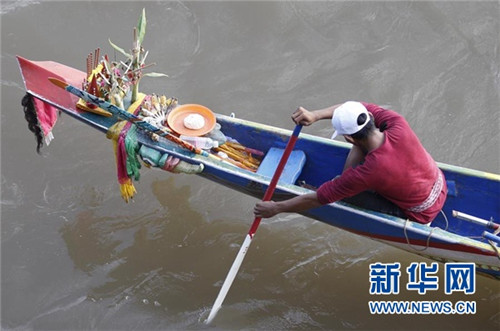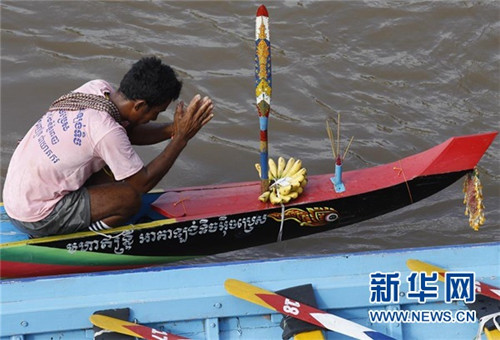 ↑11月20日,在柬埔寨金边的洞里萨河,一名男子在为送水节龙舟赛做祈祷。 新华社/欧新