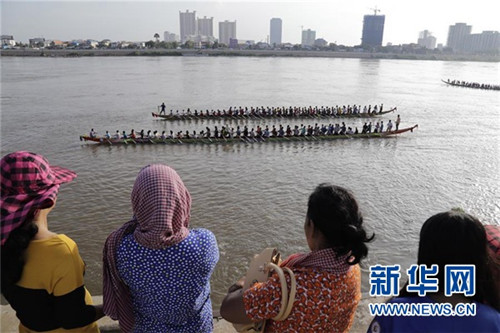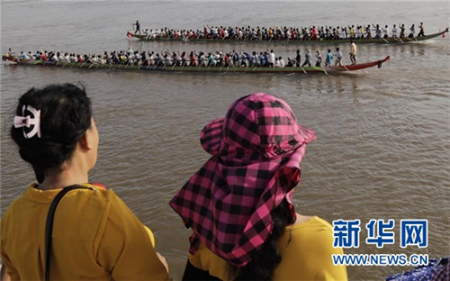↑11月20日,在柬埔寨金边的洞里萨河,当地女子在观看划龙舟排练。 新华社/欧新