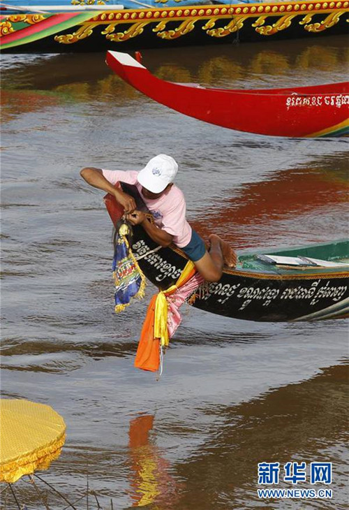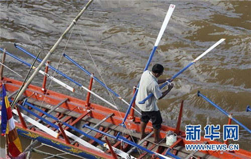 ↑11月20日,在柬埔寨金边的洞里萨河,一名男子在为送水节龙舟赛做准备。 新华社/欧新