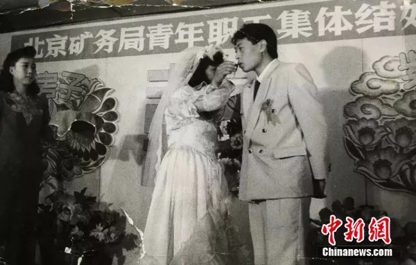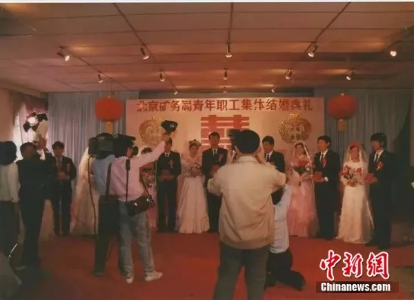 资料图:1990年,紫房子为7对煤矿工人举办了第一场集体婚礼。来源:紫房子婚庆供图。