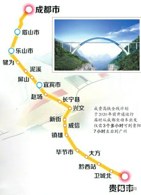 按照此前报道,如果一切顺利全线预计2020年前通车。成贵铁路为我国“八纵八横”高速铁路网中兰(西)广大通道的重要组成部分,在成都与西成高铁相连在贵阳与贵广高铁、沪昆高铁相连,不仅承担着西南地区省市间的城际、区(县)际客流运输功能,同时兼顾西南、西北地区与华南地区的长途客流运输功能。