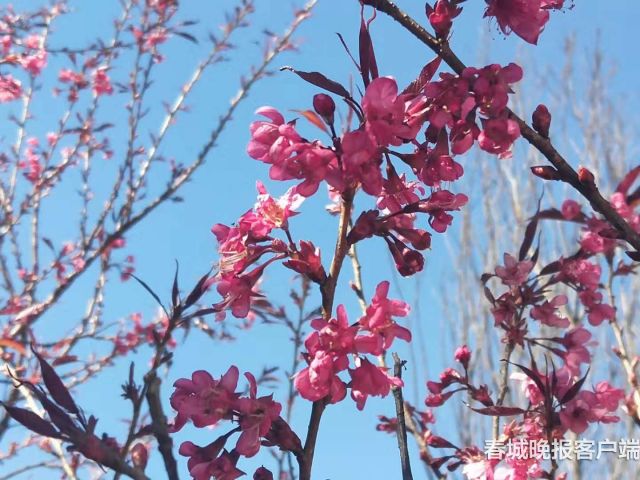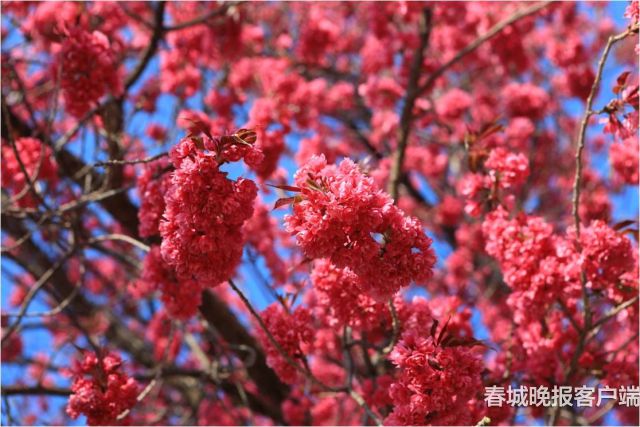 值得一提的是,复瓣云南红樱花在元旦前后,即可繁花一树,不畏霜冻,傲于寒冬。在中国人比较关注的时节,在灰白基调的背景中,以火红的颜色,为大家迎春送福。时节虽不是春天,却更似春天!