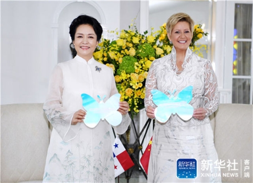 当地时间12月3日,国家主席习近平夫人、世界卫生组织结核病和艾滋病防治亲善大使、联合国教科文组织促进女童和妇女教育特使彭丽媛应邀在巴拿马总统府会见巴拿马总统夫人、联合国艾滋病规划署拉美区特别亲善大使、巴拿马全国幼儿综合护理理事会主席卡斯蒂略,并共同出席艾滋病防治公共宣传活动。这是会见后,卡斯蒂略邀请彭丽媛一同手持作为艾滋病“零歧视”运动标识的彩色纸质蝴蝶合影,表达对全球防艾抗艾事业的坚定支持。新华社 记者燕雁/摄
