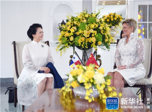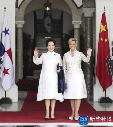 当地时间12月3日,国家主席习近平夫人、世界卫生组织结核病和艾滋病防治亲善大使、联合国教科文组织促进女童和妇女教育特使彭丽媛应邀在巴拿马总统府会见巴拿马总统夫人、联合国艾滋病规划署拉美区特别亲善大使、巴拿马全国幼儿综合护理理事会主席卡斯蒂略,并共同出席艾滋病防治公共宣传活动。新华社 记者燕雁/摄