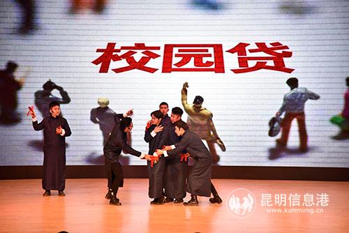 “行政法、诉讼法…”伴随着快板声,由云南艺术学院表演的节目《大学法律心中记》,六个活跃的小伙用表演和小品为大家展现了校园贷的危害、食品安全问题、聚众赌博等目前在大学生活中常见的不法行为。