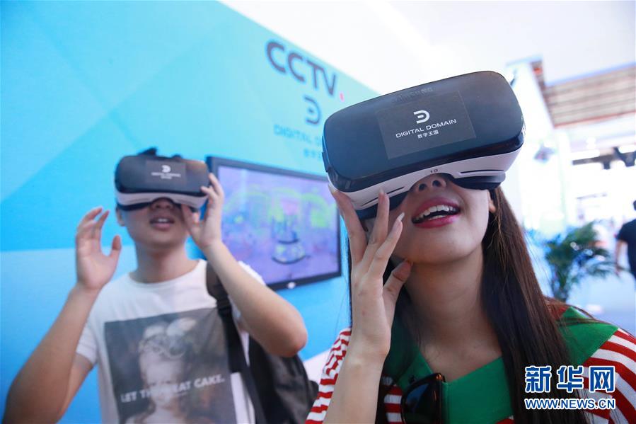 在北京国际广播电影电视展览会现场,参观者通过VR技术体验全景视频(2017年8月24日摄)。 新华社发(陈晓根/摄)