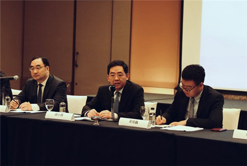 图为中国驻新加坡大使洪小勇(中)在座谈会上讲话。(图片由中国驻新加坡大使馆提供)