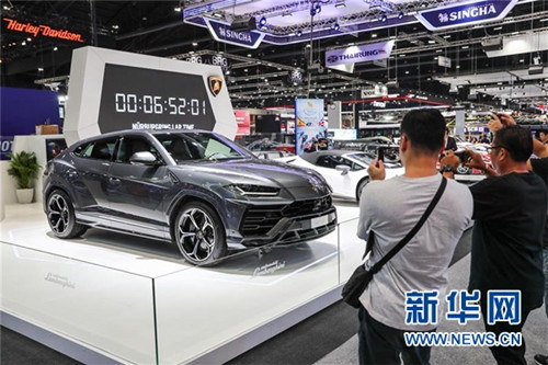 ↑12月4日,观众在泰国曼谷国际汽车博览会上参观兰博基尼Urus汽车。 新华社 记者张可任/摄