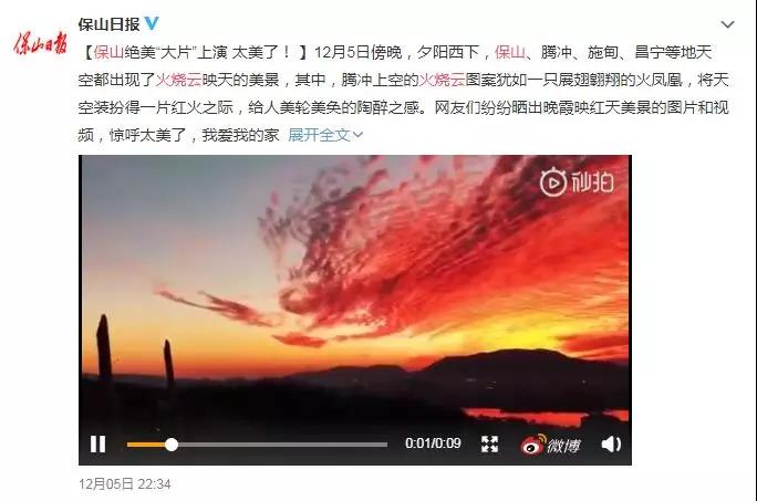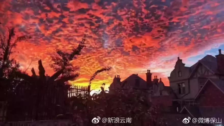 6686体育综合 12月5日傍晚,保山、腾冲、施甸、昌宁等地天空都出现了火烧云映天的美景。