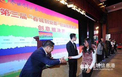 综合大众评审、网络投票和专家评审的三项成绩,创意组决赛的名次也尘埃落定。连续两次第一个出场的东南亚南亚跨境人才服务平台获得一等奖。匠桓创造——让玉文化走进生活、彩云养生花果茶、曹雄文创研发中心等项目紧随其后,获得了二等奖。彩虹面团梦工厂、智能化静脉输液控制装置、什么米水、云南道地凉茶——凤尾茶项目获得三等奖。他们都将获得代表昆明创业创新比赛最高荣誉的“春城创业奖”和相应的奖金。