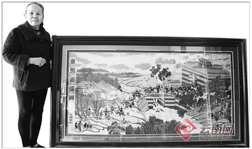 跟随彭开会的脚步进入家门,客厅墙边,她揭开久未动过的盖布,看不见的尘埃让记者连打了几个喷嚏。一件刺绣作品露出真容。她说:“这是我从48岁开始,历时10年零3个月绣成的《康熙南巡图》,里面的100多个人物表情各异。当时在翠湖边才把人物绣得差不多时,就有人出高价想预订这幅刺绣,我没有答应。我年纪大了,也许再也绣不出这样的作品了,我只想通过这幅作品把我的刺绣手艺传承下去。”
