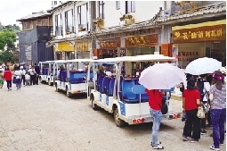 基础设施建设注重人性化。南、北入口设置防暴设施、综合执法亭、停车场,9个巷道口设置物理隔离桩,划时间段限制机动车行驶,在缓解交通的同时方便本地居民出入;每50至100米设置1个垃圾桶,并规定垃圾车每天进行早、中、晚3次清理;根据镇内区域分布,有计划地新建6个旅游公厕;沿洱海一线路边有计划地安装休憩座椅;制定景区交通组织和市场经营秩序方案,为镇内居民、学生等提供免费服务,目前已投入27辆电瓶车试运营,运送游客近7万人次;实现“三线入地”;完善道路标识、标牌等。