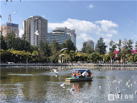 如今,春日的垂柳,夏日的荷花,秋日的海棠,冬日的海鸥都映衬在一潭碧水里,让翠湖这一核心景观更加美丽。