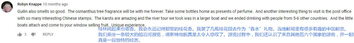 外国网友来到广西,“甲天下”的桂林山水自然是他们的必游之地。在YouTube一条关于广西的视频下,一名外国网友是这样回忆在桂林的那段美好经历的: