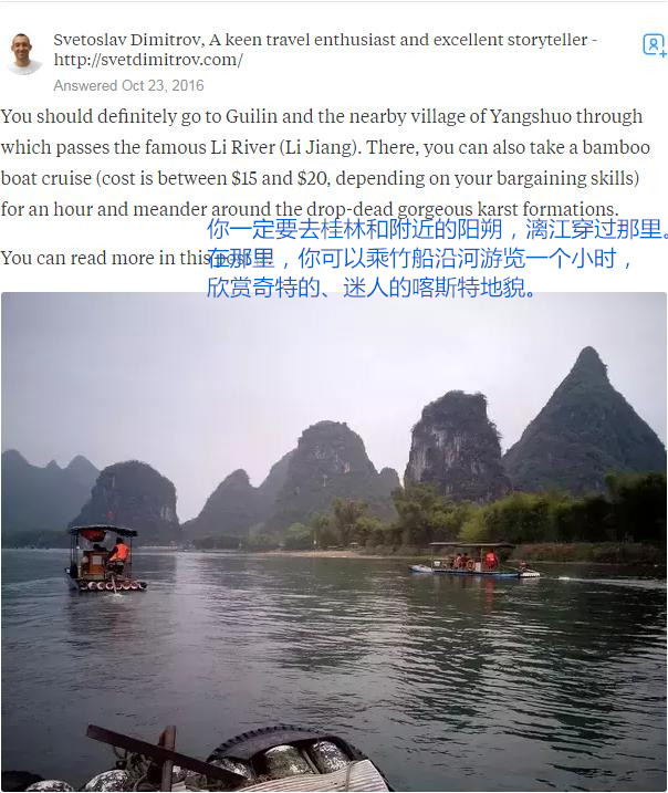 在美版知乎“Quora”网站上,有网友提问“应不应该选择桂林作为自己到中国的旅游之地”,一名热爱旅行的外国网友是这样回答的: