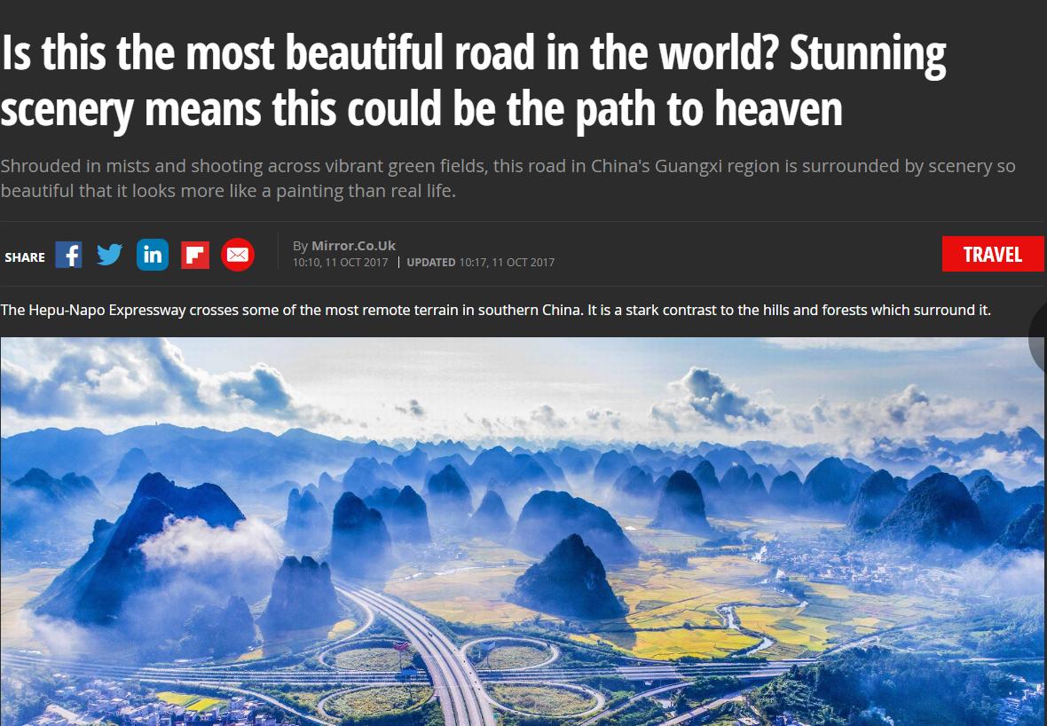 不只桂林的山水,广西还有许多美景令外国网友赞叹不已。广西合那公路就曾在外国网友中刷屏,被称为“仙境公路”。英国《镜报》网站就曾以“这是世界上最美的公路吗?迷人的风景带我们到人间天堂”为题报道过这条公路,称这条公路周围的风景如油画般美丽。