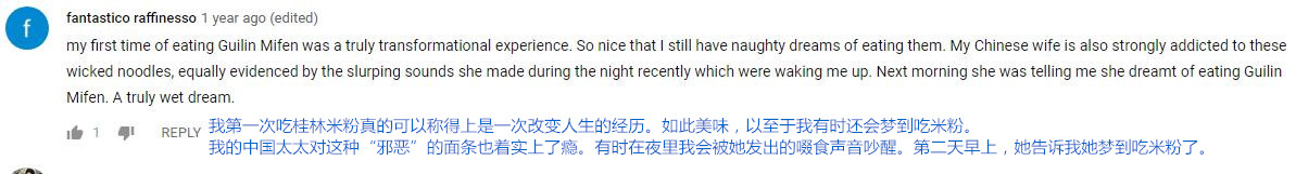 YouTube知名美食频道“The food ranger”曾做过一期关于桂林米粉的视频,点击量超过77万,点赞和评论数超过1.5万。外国“吃货”们是这样花式点赞桂林米粉的:
