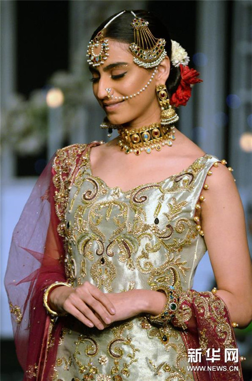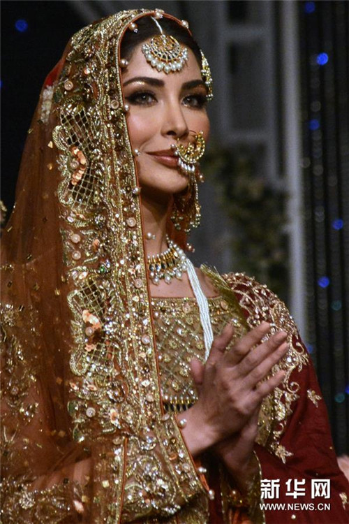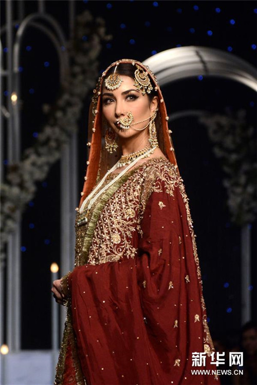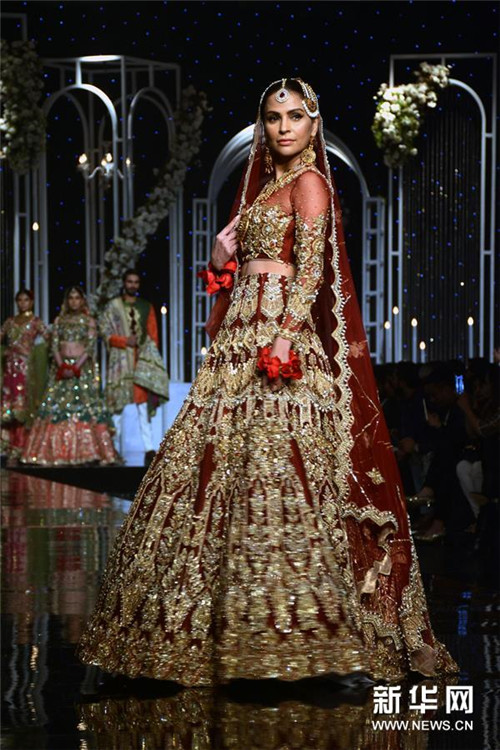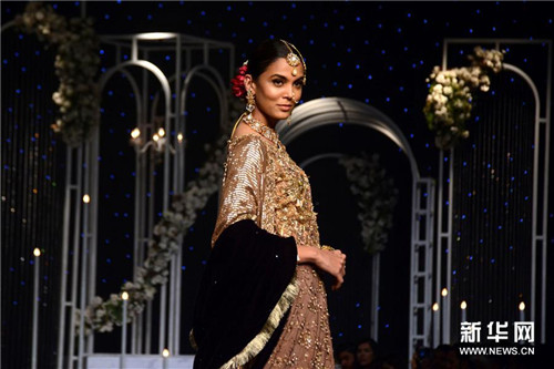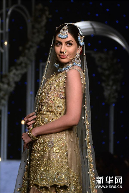 12月8日,模特在巴基斯坦拉合尔举行的婚礼时装周上展示设计师作品。 新华社发(萨贾德/摄)