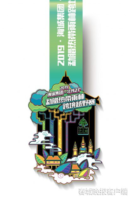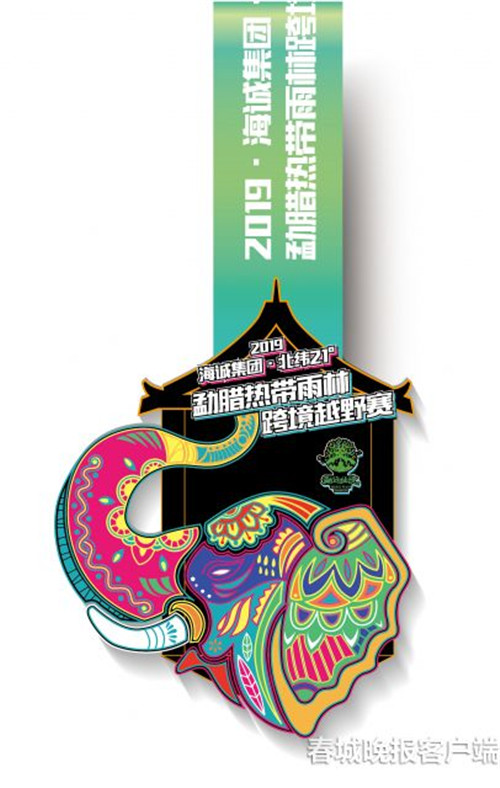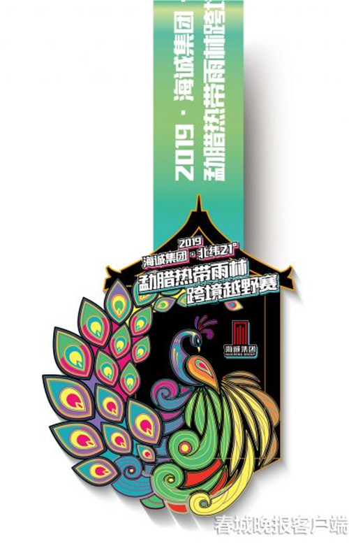 奖牌:金色描边的竹楼前是赛事冠名商“海诚集团”logo,孔雀展开五彩斑斓的羽翼,外圈是翠绿和靛蓝,内圈是金黄,橙色和桃红点缀期间,巨大的“孔雀眼”让人无法移开视线。孔雀微微底下脖颈,迎接国际跑步爱好者的到来。