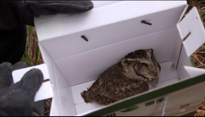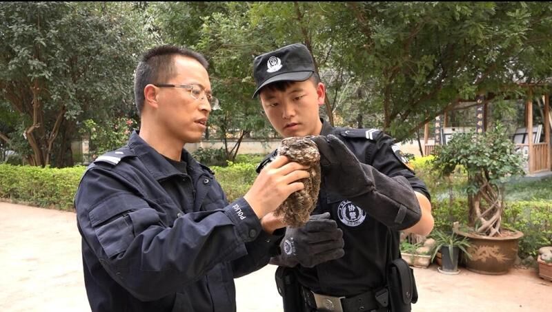 接警后,森林公安民警赶到肖先生宿舍将鸟带回单位,经科普比对和向野生动物专家咨询,该鸟为国家二级保护动物领角鸮。经检测,展翼长54厘米,体长20厘米,重155克。在检查中,发现领角鸮头部有轻微擦伤,立即进行处理,民警分析可能是坠落时撞地所致。通过几天的喂养观察,领角鸮身体逐渐痊愈,目前民警已将其带到野外放归自然。