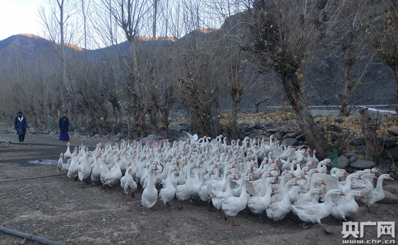 自基地建起后,仁青拉姆一直在这里负责鹅的喂养和照料这些工作。她说,家里有年迈的老人还有正在上学的小孩,所以即便想出去打工赚钱都没办法。现在有了领头羊,家门口就可以挣到钱。仁青拉姆说:“我现在每个月至少有一千五百块,忙完基地的活还能干自家的农活。基地挣钱了,还给我们每家都安了太阳能热水器,生活越来越好了。”