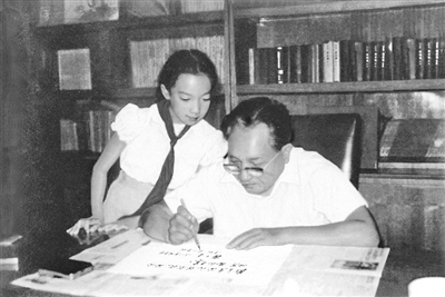 照片拍摄于书房,书架前的写字台上铺着旧报纸,戴眼镜、着白色短袖衬衫的邓小平正俯身桌前,用小楷毛笔在一张A4纸大小的白纸上题字。他的身侧,戴着红领巾的外孙女棉棉倾斜身子眺望,想看看外公写了什么。棉棉的妈妈邓榕是照片的拍摄者,底片送到学校冲洗出来后大家才发现,傻瓜相机拍出的画面还有些失真。