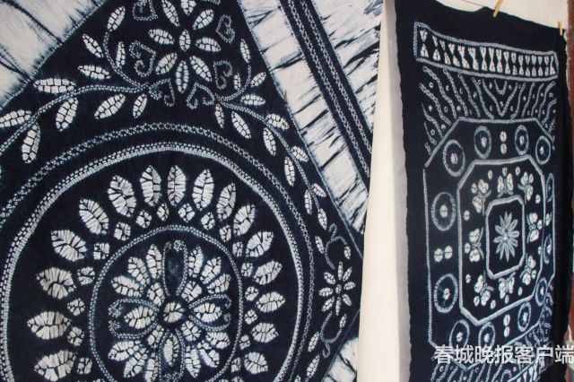 张翔家的白族小院也是爷爷张仕绅的故居,绿油油的板蓝根长得茁壮,敲打板蓝根的清脆响声和漂洗扎染的潺潺水声整日不断。在繁杂的蓝靛泥制作工序后,把扎染图案设计在塑料布上,绘图,刻板,再将颜料渗透到布上,发给村里的人去扎花,收回来浸泡,脱浆,染色,再经过漂洗和晾晒,精致的板蓝根植物染色的扎染跃然眼前。扎染被制成门帘、小方巾远销日本韩国,还创新出扎染T恤、包包、围巾。