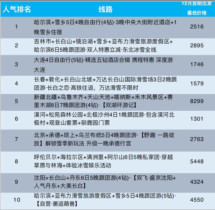 数据显示,昆明出发的人气冰雪线路包括吉林市+长白山+镜泊湖+雪乡+亚布力滑雪旅游度假区+哈尔滨6日5晚跟团游,参考起价2895元;新疆北疆+乌鲁木齐+天山天池+喀纳斯+禾木风景区+赛里木湖8日7晚跟团游,参考起价8299元;呼伦贝尔+海拉尔区+满洲里+阿尔山6日5晚私家团,参考起价5448元。