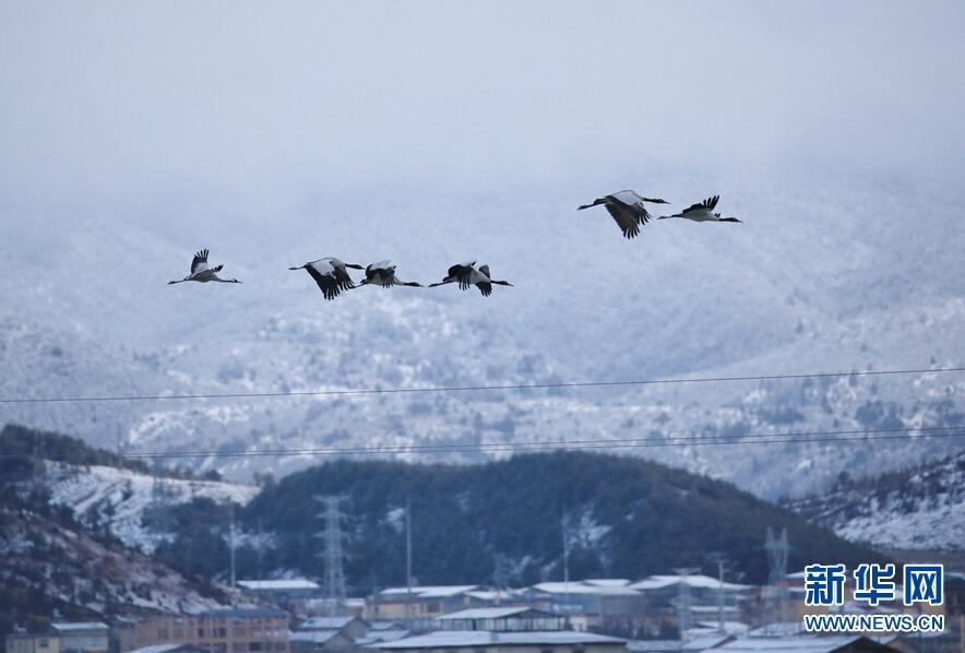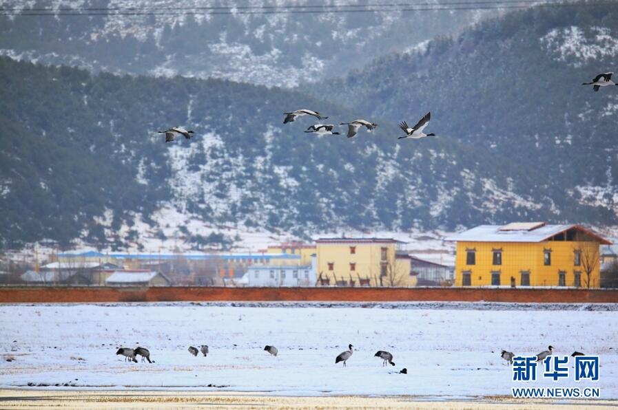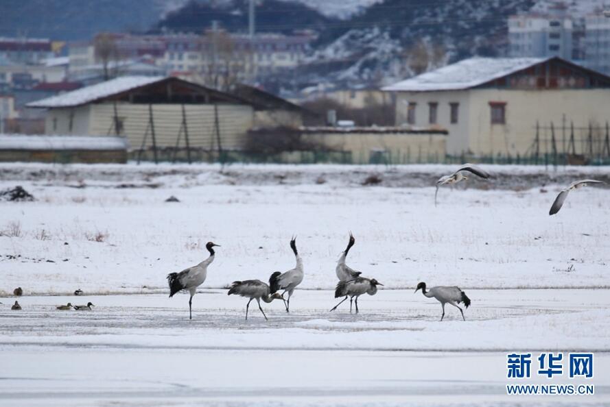 纳帕海自然保护区,雪地里的“小精灵”黑颈鹤。(新华网发 崔永江/摄)