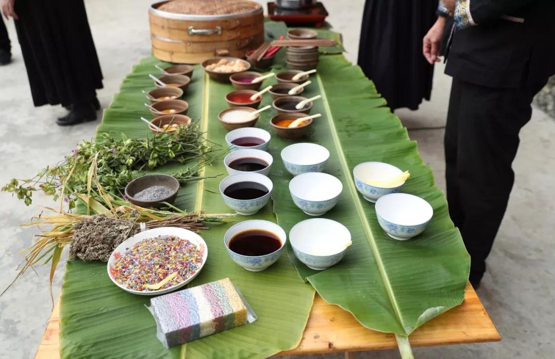 以可食用的黄花草枫叶、紫香藤等植物的浆汁浸泡糯米,让其染上天然植物的颜色,再蒸出不同颜色。这种七彩花米饭清香扑鼻,甜软可口,有“五谷丰登”“吉祥如意”的寓意,是当地人的家常必备。