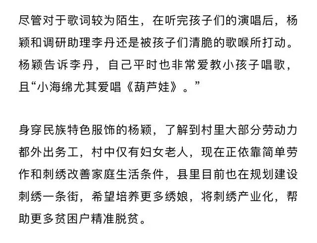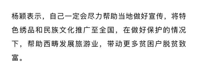 杨颖表示,自己这次来西畴既走访了当地特色产业,了解了当地特色产品,还观赏了少数民族极富特色的文化传统和极具历史人文价值的崖画及童谣等,收获颇丰。希望尽己所能做好宣传工作,保护宝贵的文化遗产,帮助当地发展旅游业等特色产业,为脱贫致富助力。