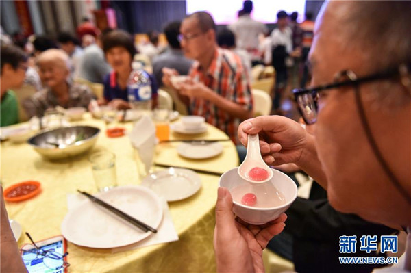 12月21日,在马来西亚吉隆坡,人们在宴会上品尝汤圆。 当日,马来西亚当地华人为迎接冬至到来举办“2018四季中华—温馨冬至”活动。 新华社 张纹综/摄