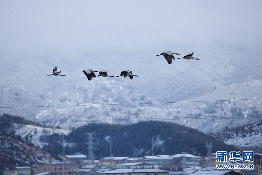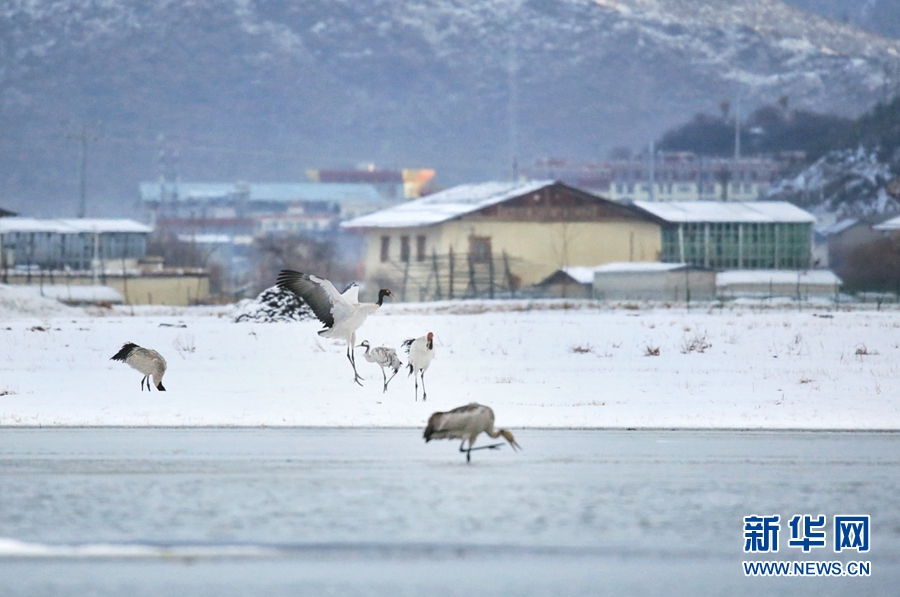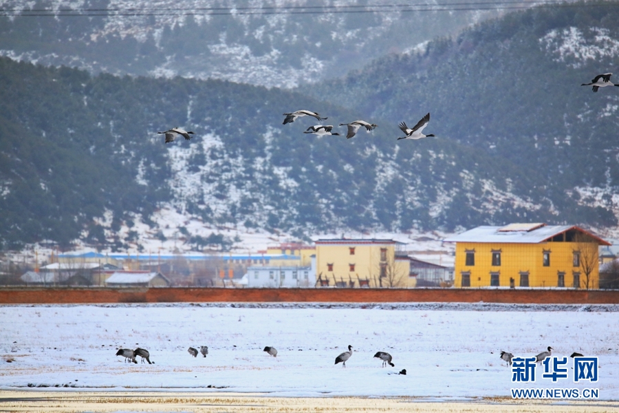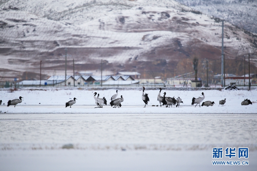 纳帕海自然保护区,雪地里的“小精灵”黑颈鹤。新华网发(崔永江 摄)