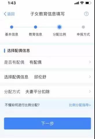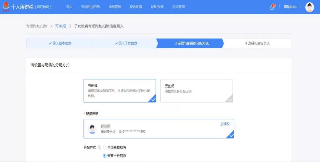有配偶(填写真实配偶信息,并选择跟配偶的扣除分配比例)或 无配偶(请据实选择分配比例)