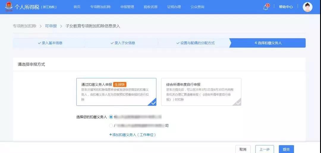 你也可以选择通过扣缴义务人扣除,或者选择综合所得年度自行申报。