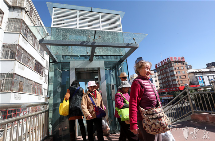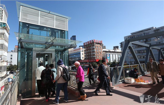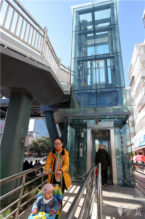 天桥装了电梯,行人可以通过电梯直接上下天桥,无需绕行距离较远的楼梯,对于老人、小孩以及携带重物的行人来说,都十分方便。(云报客户端 记者杨峥)